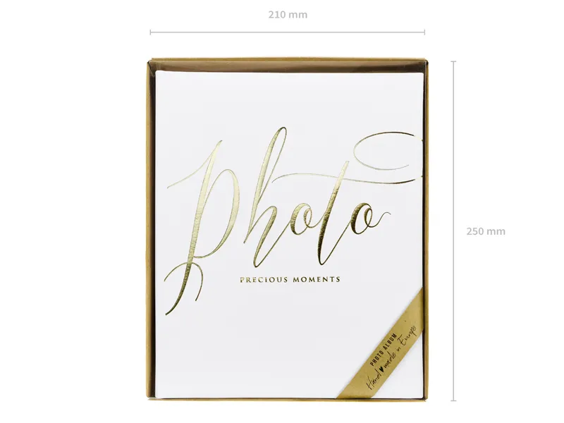 Album na zdjęcia oprawiony papierem w kolorze białym ze złotym napisem Photo, precious moments, wymiary ok. 20 x 24,5 cm, 22 kartki.