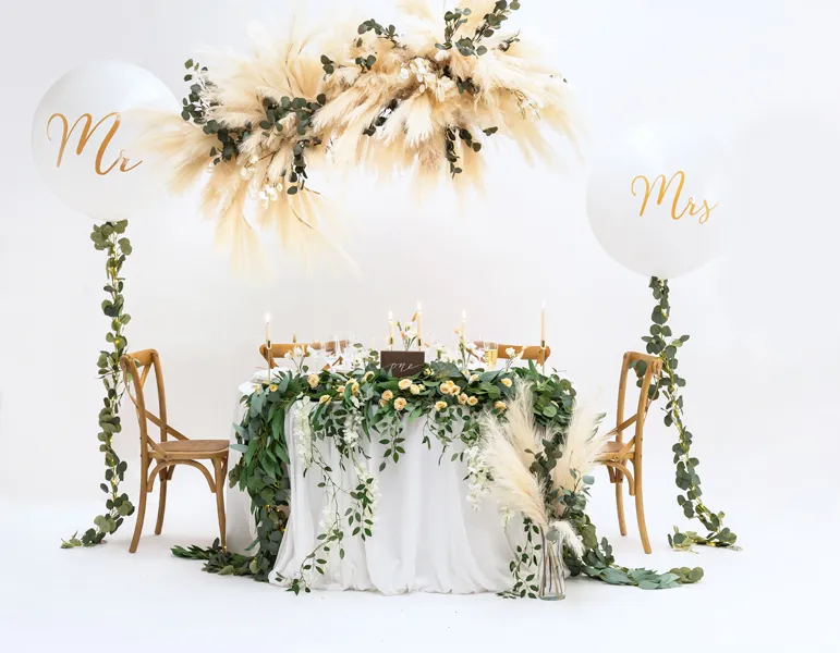 Balon o średnicy ok. 1 m, biały pastelowy ze złotym nadrukiem Mr, wentyl umieszczony u dołu, do nadmuchania potrzeba 0,4 m3 helu.