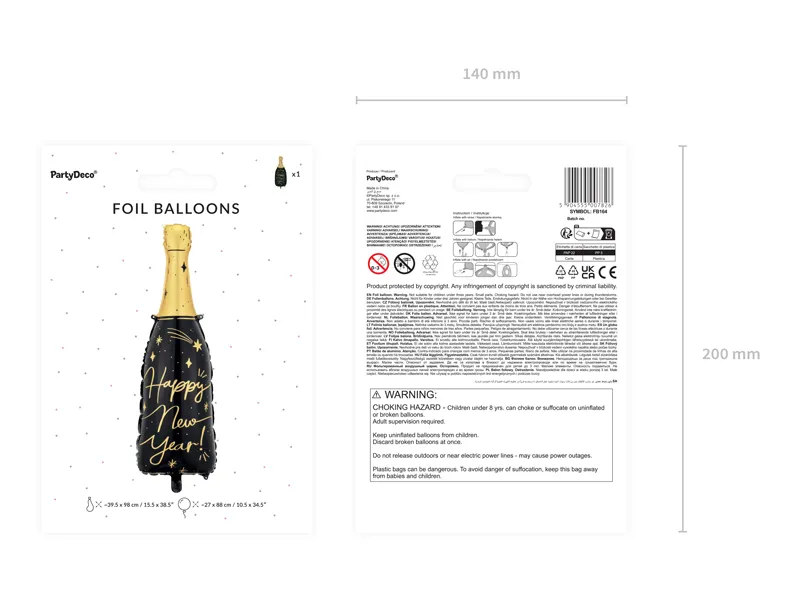 Balon foliowy Butelka Happy New Year, mix kolorów, wymiary przed napompowaniem ok. 39,5 x 98 cm (15,5 x 38,5”), wymiary po napompowaniu ok. 27 x 88 cm (10,5 x 34,5”). Do napompowania powietrzem i helem. Zestaw zawiera słomkę..