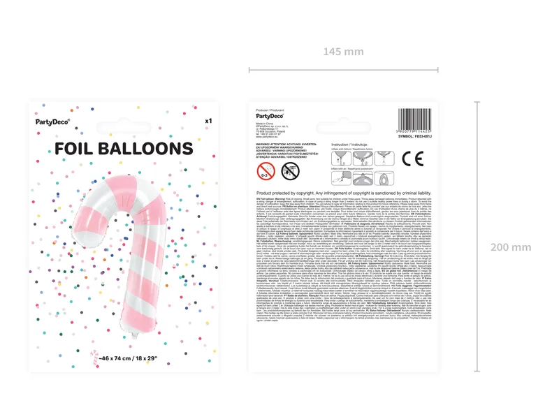 Błyszczący balon foliowy Cukrowa laska w kolorze białym w różowe paski, wymiary ok. 50 x 82 cm (19.5 x 32”).