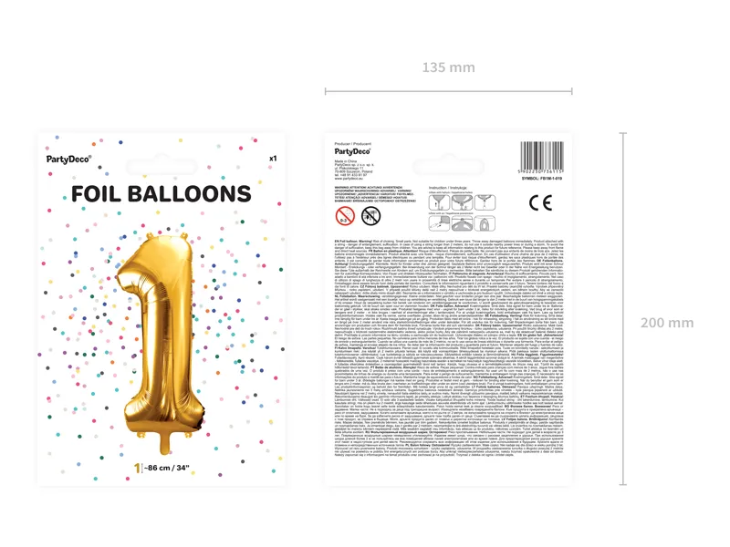 Balon foliowy metalizowany Cyfra 1 w kolorze złotym, rozmiar przed napompowaniem ok. 100 cm (39”), rozmiar po napompowaniu ok. 86 cm (34”). Do napompowania powietrzem i helem. Balon jest samouszczelniający się. Posiada haczyki ułatwiające montaż balona do dekoracji.