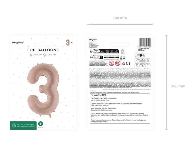 Balon foliowy matowy Cyfra 3 w kolorze ciemnobeżowym, rozmiar przed napompowaniem ok. 86 cm (34”), rozmiar po napompowaniu ok. 72 cm (28”). Do napompowania powietrzem i helem. Zestaw zawiera słomkę. Balon jest samouszczelniający się. Posiada haczyki ułatwiające montaż balona do dekoracji.