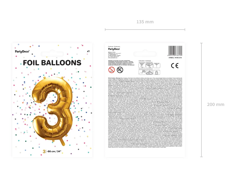 Balon foliowy metalizowany Cyfra 3 w kolorze złotym, rozmiar przed napompowaniem ok. 100 cm (39”), rozmiar po napompowaniu ok. 86 cm (34”). Do napompowania powietrzem i helem. Balon jest samouszczelniający się. Posiada haczyki ułatwiające montaż balona do dekoracji.
