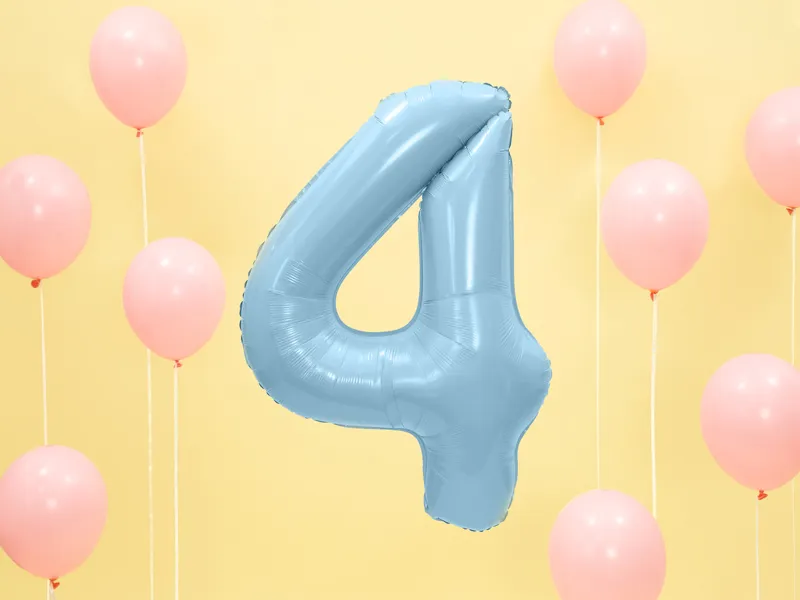 Balon foliowy pastelowy Cyfra 4 w kolorze jasnoniebieskim, rozmiar przed napompowaniem ok. 100 cm (39”), rozmiar po napompowaniu ok. 86 cm (34”). Do napompowania powietrzem i helem. Balon jest samouszczelniający się. Posiada haczyki ułatwiające montaż balona do dekoracji.