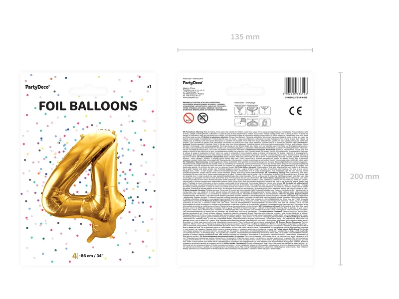Balon foliowy metalizowany Cyfra 4 w kolorze złotym, rozmiar przed napompowaniem ok. 100 cm (39”), rozmiar po napompowaniu ok. 86 cm (34”). Do napompowania powietrzem i helem. Balon jest samouszczelniający się. Posiada haczyki ułatwiające montaż balona do dekoracji.