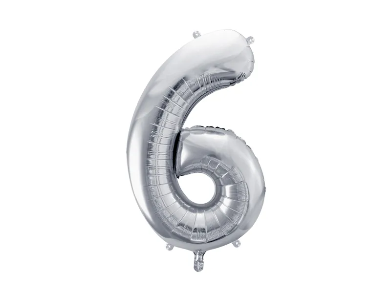 Balon foliowy metalizowany Cyfra 6 w kolorze srebrnym, rozmiar przed napompowaniem ok. 86 cm (34”), rozmiar po napompowaniu ok. 72 cm (28”). Do napompowania powietrzem i helem. Zestaw zawiera słomkę. Balon jest samouszczelniający się. Posiada haczyki ułatwiające montaż balona do dekoracji.