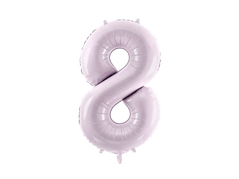 Balon foliowy pastelowy Cyfra 8 w kolorze fioletowym, rozmiar przed napompowaniem ok. 86 cm (34”), rozmiar po napompowaniu ok. 72 cm (28”). Do napompowania powietrzem i helem. Zestaw zawiera słomkę. Balon jest samouszczelniający się. Posiada haczyki ułatwiające montaż balona do dekoracji.