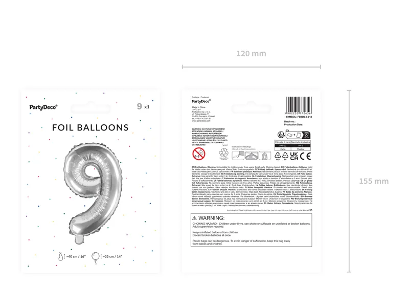 Balon foliowy metalizowany Cyfra ”9” w kolorze srebrnym, rozmiar przed napompowaniem ok. 40 cm (16”), rozmiar po napompowaniu ok. 35 cm (14”). Do napompowania powietrzem.