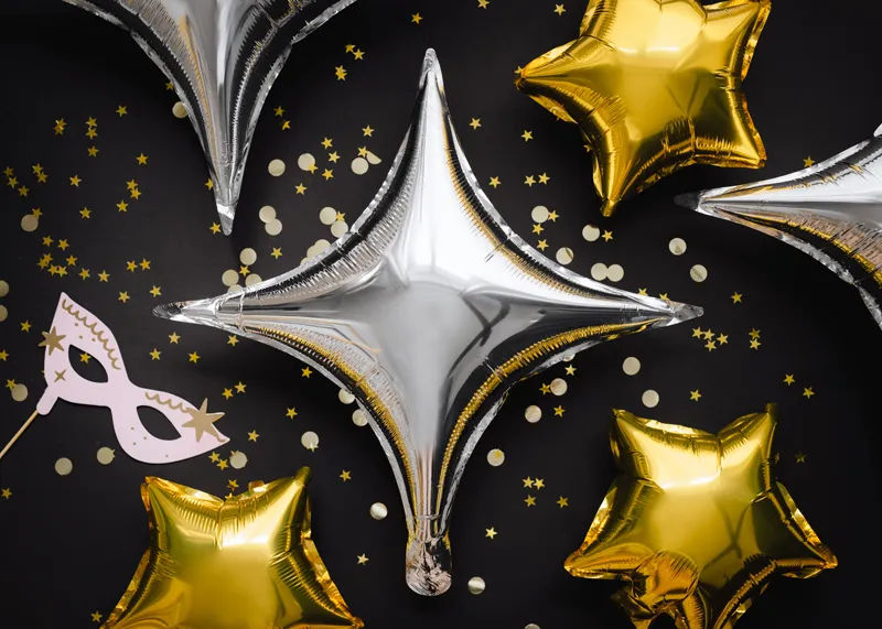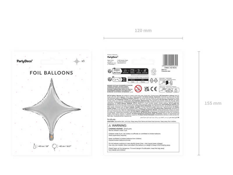 Balon foliowy metalizowany Gwiazda 4-ramienna w kolorze srebrnym, wymiary przed napompowaniem ok. 45 cm (18”), wymiary po napompowaniu ok. 42 cm (16.5”). Do napompowania powietrzem. Zestaw zawiera słomkę.
