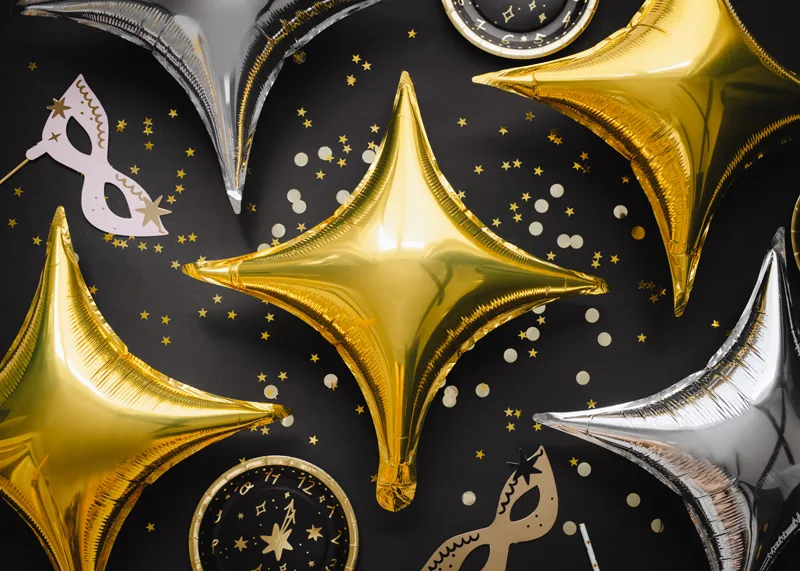 Balon foliowy metalizowany Gwiazda 4-ramienna w kolorze złotym, wymiary przed napompowaniem ok. 45 cm (18”), wymiary po napompowaniu ok. 42 cm (16.5”). Do napompowania powietrzem. Zestaw zawiera słomkę.