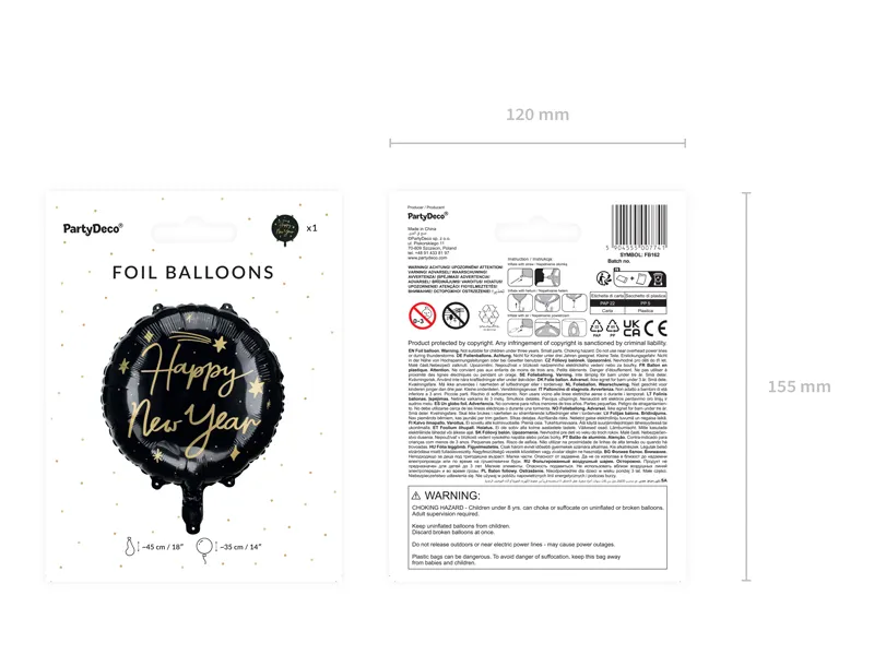 Balon foliowy Happy New Year w kolorze czarnym ze złotym nadrukiem, wymiary przed napompowaniem ok. 45 cm (18”), wymiary po napompowaniu ok. 35 cm (14 ”). Do napompowania powietrzem i helem. Zestaw zawiera słomkę.