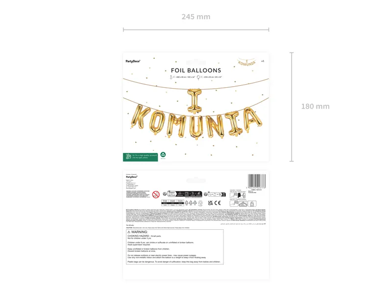 Balon foliowy ”I Komunia” w kolorze złotym, wymiary przed napompowaniem ok. 260 x 40 cm (102 x 16”), wymiary po napompowaniu ok. 210 x 35 cm (82.5 x 14”). Do napompowania powietrzem. Zestaw zawiera słomkę.