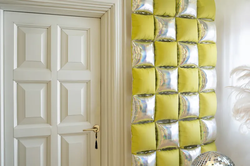 Tło foliowe balonowe Kwadrat dwustronne, z jednej strony w kolorze matowym żółtym, z drugiej błyszczącym holograficznym. Zestaw zawiera 4 balony kwadraty. Wymiary przed napompowaniem ok. 40 x 40 cm, wymiary po napompowaniu 35 x 35 cm. Do napompowania powietrzem. Zestaw zawiera słomkę. Instrukcja montażu na grafice pod zdjęciem. Wszystkie balony foliowe kurtyny Kwadraty dostępne w ofercie są w takim samym rozmiarze dzięki czemu możliwe jest dowolne łączenie kwadratów ze sobą. (1 op. / 4 szt.)