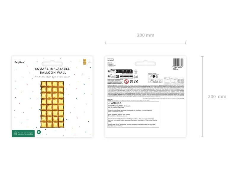 Tło foliowe balonowe Prostokąt w kolorze złotym z błyszczącym wykończeniem. Wymiary przed napompowaniem ok. 72x143cm. Wymiary po napompowaniu 55×110 cm. Zestaw zawiera słomkę. Montaż: W celu nadmuchania balonu powietrzem użyj słomki bądź pompki ręcznej. Dookoła balonu znajduje się pasek folii, który nie napełnia się powietrzem podczas pompowania, co umożliwia łączenie balonów oraz ich przymocowanie do gładkiej powierzchni. Do montażu zalecamy użycie kropek klejowych. Instrukcja montażu jest dostępna w filmiku pod zdjęciem produktu. Wszystkie tła foliowe balonowe Prostokąty dostępne w ofercie są w takim samym rozmiarze dzięki czemu możliwe jest dowolne łączenie balonów ze sobą.