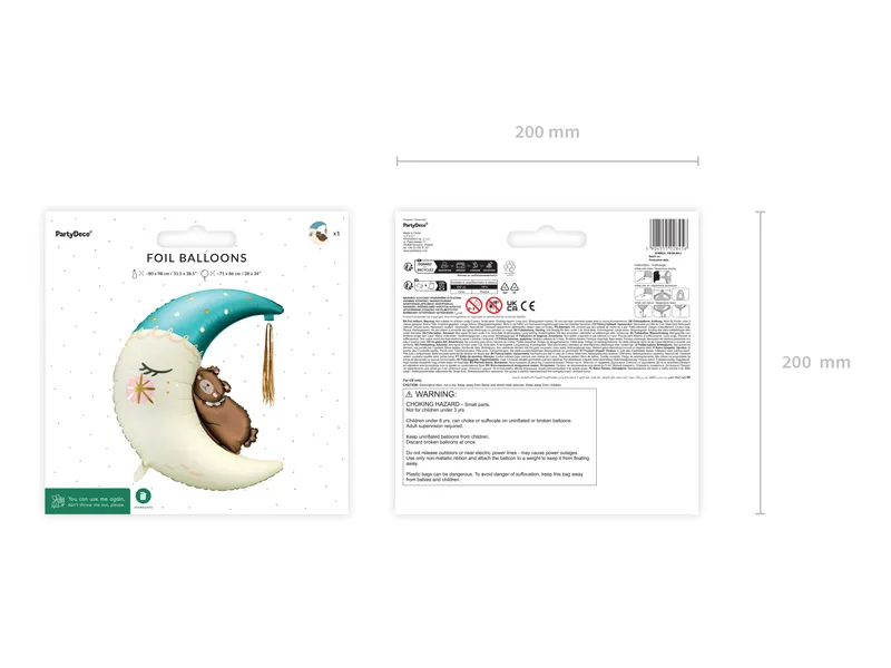 Balon foliowy Miś na księżycu, mix kolorów z jasnoniebieskim elementem i frędzlem w kolorze złotym, wymiary przed napompowaniem ok. 80 x 98 cm (31.5 x 38.5”), wymiary po napompowaniu ok. 71 x 86 cm (28 x 34”). Do napompowania powietrzem i helem. Zestaw zawiera słomkę oraz złoty frędzelek.