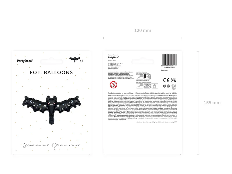 Balon foliowy Nietoperz w kolorze czarnym z holograficznym nadrukiem, wymiary przed napompowaniem ok. 40,5 x 13 cm (16 x 5″), wymiary po napompowaniu ok. 35 x 12 cm (14 x 4,5″). Do napompowania powietrzem. Zestaw zawiera słomkę.