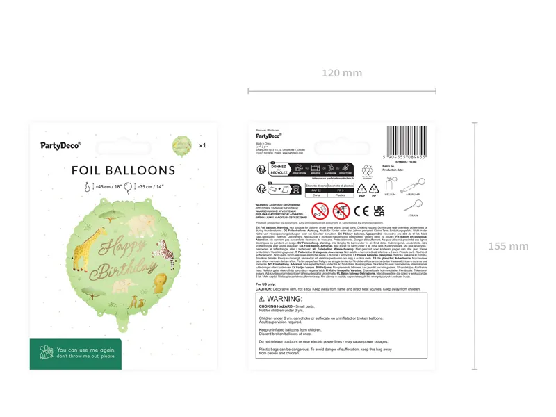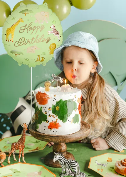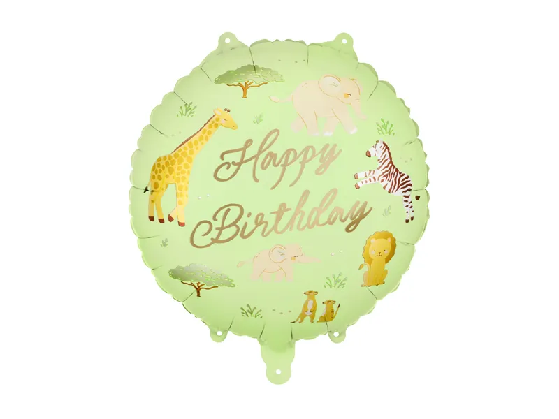 Balon foliowy pastylka ”Happy Birthday” Safari, mix kolorów. Wymiary przed napompowaniem ok. 45 x 45 cm (18 x 18”), wymiary po napompowaniu ok. 35 x 35 cm (14 x 14”). Do napompowania powietrzem i helem. Zestaw zawiera słomkę.