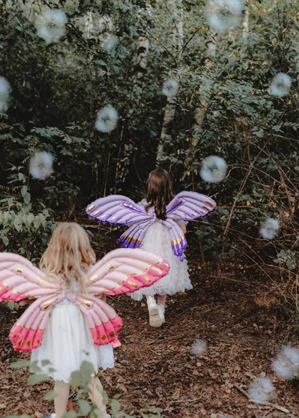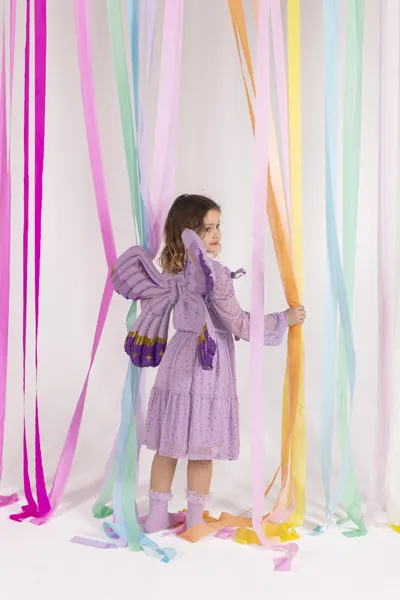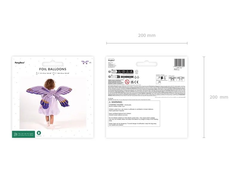 Balon foliowy w kształcie skrzydeł motyla, ze sznurkami do przywiązania do pleców, kolor fioletowy matowy, wym. ok. 102 x 50 cm. Do napompowania powietrzem. Zestaw zawiera słomkę.