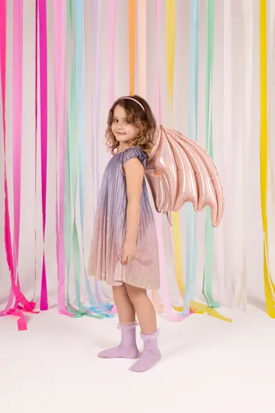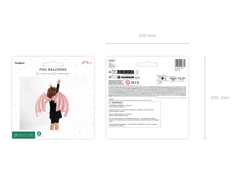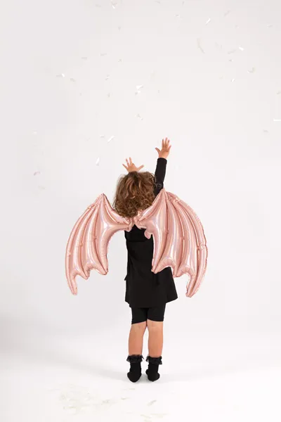 Balon foliowy w kształcie skrzydeł nietoperza, ze sznurkami do przywiązania do pleców, kolor różowy holograficzny, wym. ok. 85 x 50 cm. Do napompowania powietrzem. Zestaw zawiera słomkę.