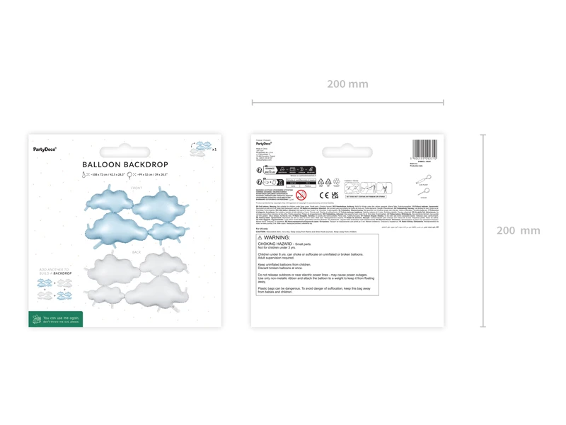 Tło foliowe balonowe Chmurki dwustronne o satynowym wykończeniu, z jednej strony w kolorze białym, z drugiej jasno niebieskim. Wymiary przed napompowaniem ok. 108 x 72 cm (42.5 x 28.3”), wymiary po napompowaniu ok. 99 x 52 cm (39 x 20.5”). Do napompowania powietrzem. Zestaw zawiera słomkę.