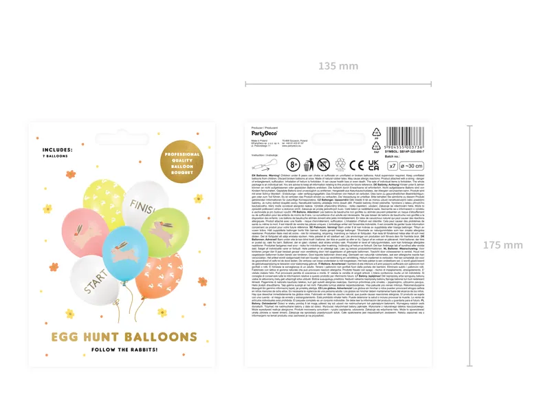 Zestaw 50 sztuk: pastelowy w kolorze Pink z kolorowym nadrukiem, pastelowy w kolorze Sky Blue z kolorowym nadrukiem, pastelowy Apple Green z kolorowym nadrukiem, w kolorze Yellow z białym pięciostronnym nadrukiem, w kolorze Orange z białym pięciostronnym nadrukiem, średnica ok. 30 cm.