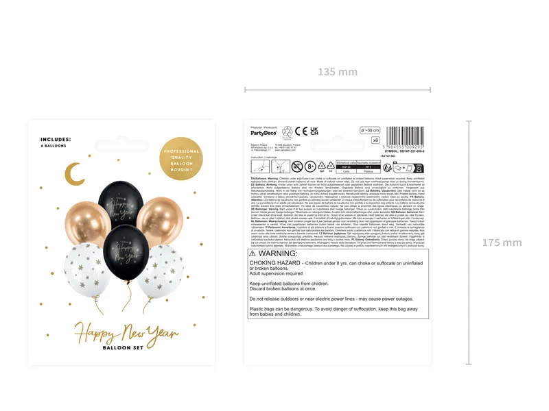 Zestaw 6 sztuk zestaw zawiera 2 balony w kolorze White z nadrukiem, 2 w kolorze Black z nadrukiem, 2 metalizowane w kolorze złotym, średnica ok. 30 cm.