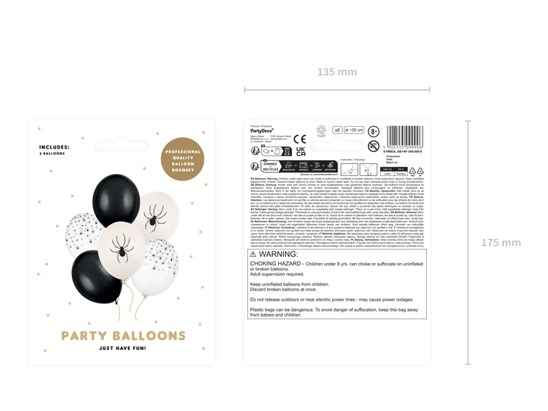 Balony Strong Pająki z nadrukiem, zestaw zawiera 2 kolory balonów (Pastel Off-white i Crystal Clear) z nadrukiem oraz gładkie balony w kolorze Pastel Black, średnica ok. 30 cm. (1 op. / 6 szt.)