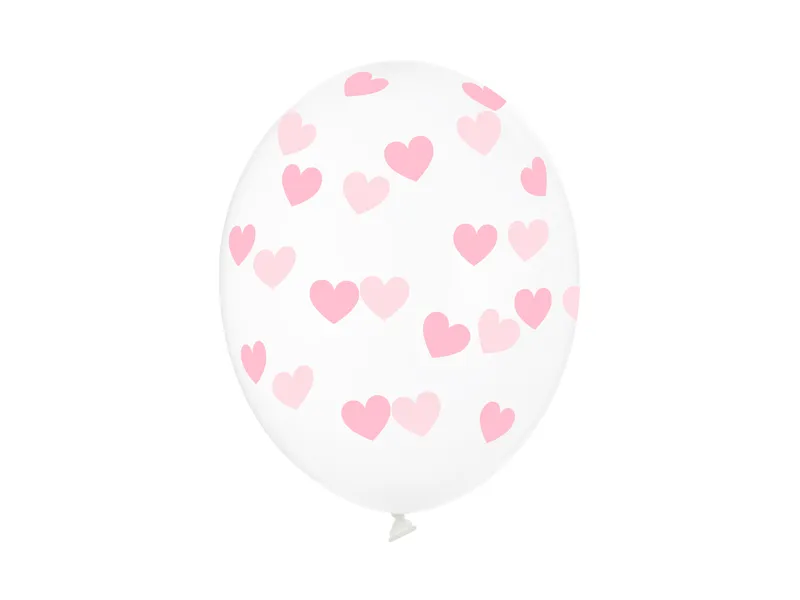 Balony Strong Serduszka w kolorze Crystal Clear, z jasnoróżowym, pięciostronnym nadrukiem, średnica 30 centymetrów.