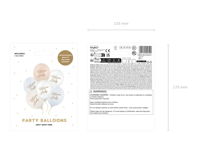 Balony Strong Welcome Baby z nadrukiem, zestaw zawiera 4 kolory balonów (Pastel Light Misty Blue, Pastel Off-white, Pastel Nude i Metallic Pure White) z dwustronnym nadrukiem, średnica ok. 30 cm.