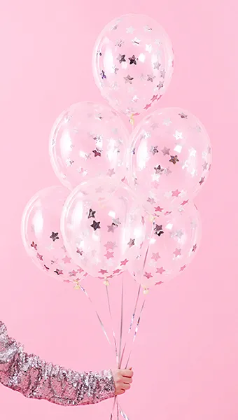 Transparentne balony ze srebrnym metalizowanym konfetti w kształcie gwiazdek w środku, średnica balonu ok. 30 cm. (1 op. / 6 szt.)