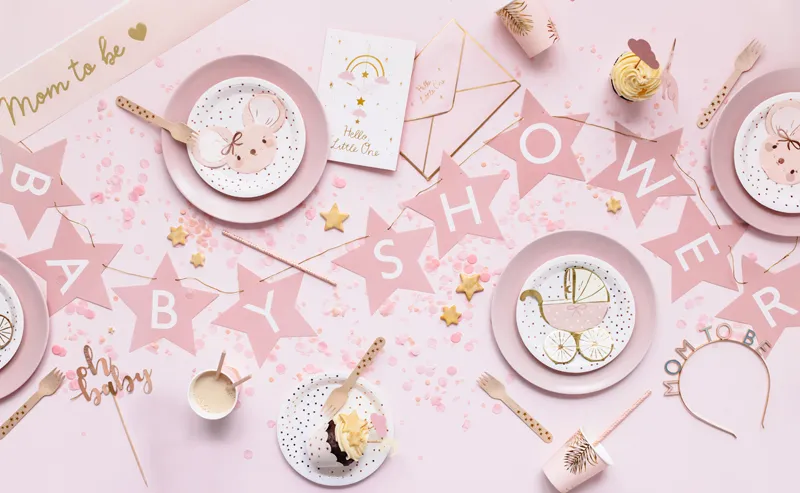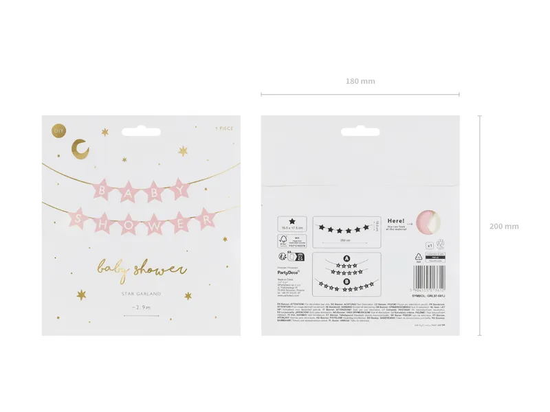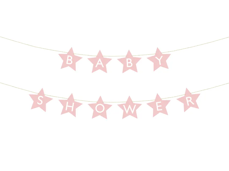 Baner w kształcie gwiazdek z napisem Baby Shower wykonany z papieru w kolorze jasnoróżowym, wymiary sznurka ok. 3m.