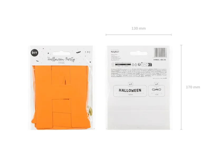 Baner napis Halloween wykonany z papieru w kolorze pomarańczowym. Wysokość ok. 14 cm, długość sznurka ok. 3 m. Produkt do samodzielnego złożenia.