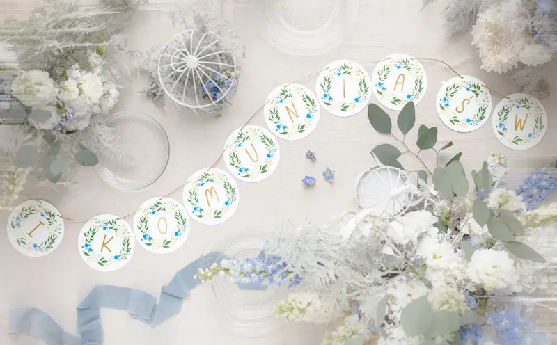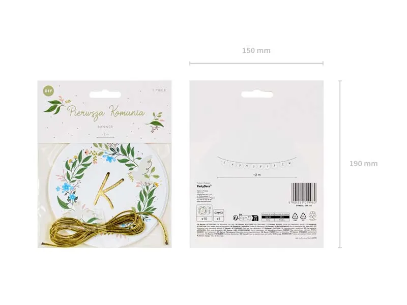 Baner ”I Komunia Św.” wykonany z papieru, mix kolorów. Wysokość ok. 13 cm, długość sznurka ok. 2 m.