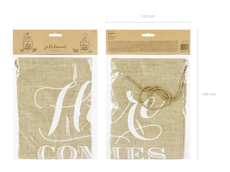 Baner na przejście Panny młodej wykonany z juty, z białym napisem Here comes the bride, wymiary ok. 41 x 51 cm.