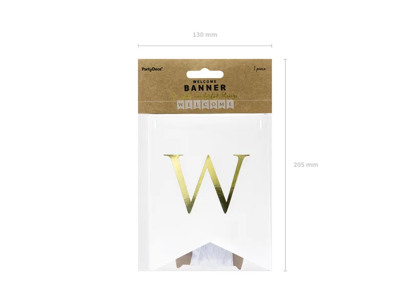 Baner w kolorze białym ze złotym napisem Welcome, do samodzielnego złożenia, zestaw zawiera literki i ok. 2,5 m białej tasiemki, wymiary po złożeniu: wysokość ok. 15 cm, długość ok. 95 cm.