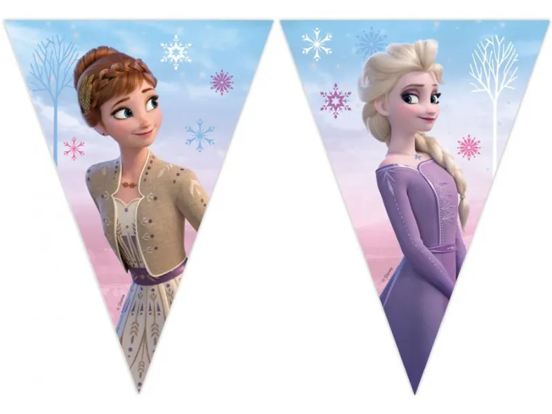 Baner składa się z dziewięciu papierowych flag połączonych sznurkiem, które całkowicie mają około 230 cm długości. Każda flaga prezentuje fragment grafiki inspirowanej Krainą Lodu II, z postaciami Elsy i Anny na tle lodowych ornamentów i podmuchów wiatru w stylu „Wind Spirit”. Produkt wykonano z certyfikowanego papieru FSC co świadczy o świadomym podejściu do materiałów. Dzięki temu każda dekoracja pochodzi z odpowiedzialnego źródła, a motyw jest zgodny z pozostałymi produktami z tej samej serii dekoracyjnej Procos.