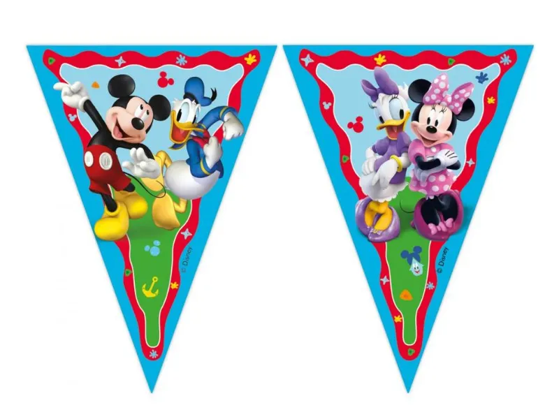 Banner Mickey Rock The House to dekoracja, która przyciąga uwagę od pierwszego spojrzenia. Kolorowe flagi przedstawiają postać Myszki Miki w dynamicznych pozach, otoczoną żywymi kolorami i muzycznymi akcentami. Dominujące barwy to czerwień, granat, błękit oraz żółć, wszystkie skomponowane w sposób, który podkreśla energię i radość płynącą z grafiki. Każda flaga wykonana jest z dbałością o detale, co sprawia, że całość prezentuje się bardzo estetycznie i profesjonalnie. Tego typu dekoracja nie tylko zdobi, ale również buduje scenografię całego przyjęcia i tworzy tło dla pamiątkowych zdjęć.