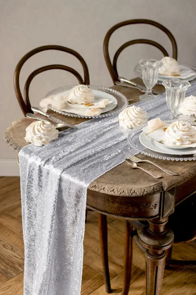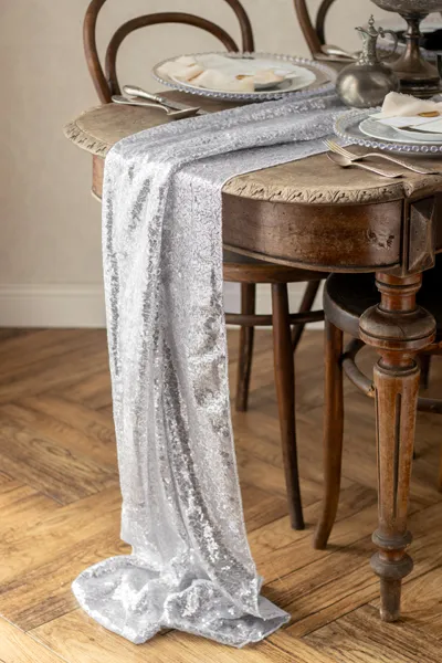 Bieżnik z siateczki dekoracyjnej z cekinami w kolorze srebrnym, szerokość ok. 30 cm, długość ok. 5 m.