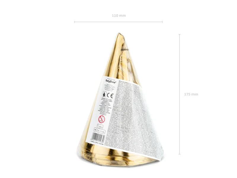 Czapeczki w kolorze metalizowanym złotym z białym napisem 18th Birthday!, wysokość ok. 16 cm, średnica ok. 11 cm. (1 op. / 6 szt.)