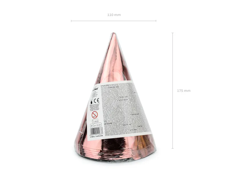 Czapeczki wykonane z papieru w kolorze różowego złota, wysokość ok. 16 cm, średnica ok. 10 cm. (1 op. / 6 szt.)