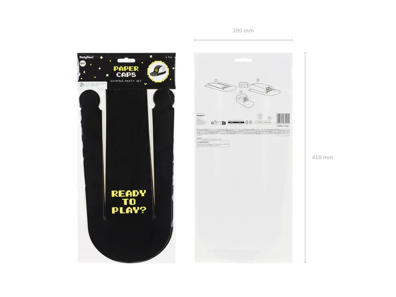 Czapki „Gamer” w eleganckim czarnym kolorze o wymiarach 38,5 × 18,5 cm to stylowy i uniwersalny dodatek do imprez tematycznych z motywem gier komputerowych. Zestaw sześciu czarnych czapek wykonanych z solidnego papieru, ozdobionych minimalistycznym, nowoczesnym nadrukiem nawiązującym do gamingu, to idealne uzupełnienie imprezy gamingowej, LAN‑party czy urodzin dla fana gier.