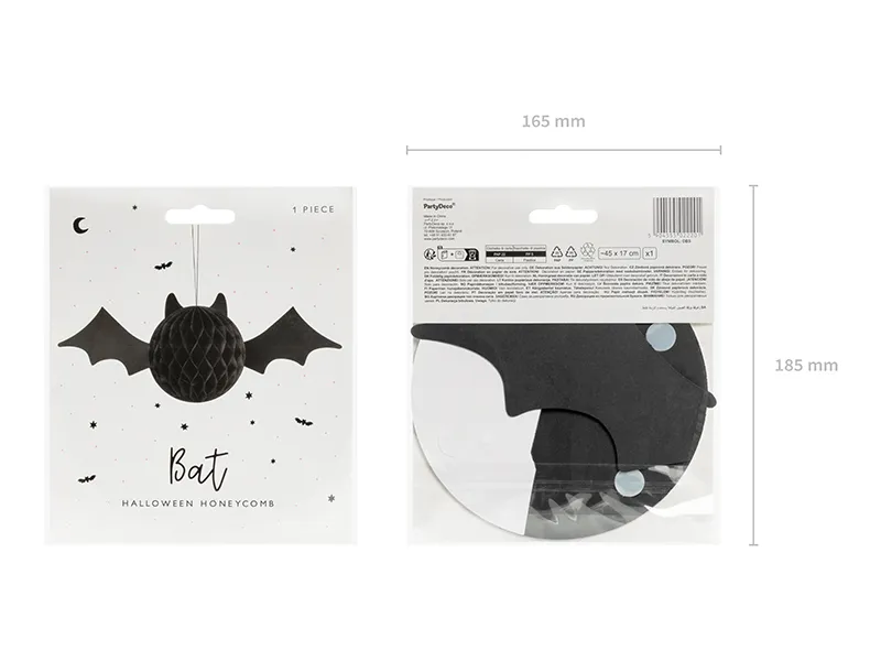 Dekoracja bibułowa Nietoperz w kolorze czarnym. Średnica ok. 15 cm, szerokość po rozłożeniu ok. 45×17 cm.