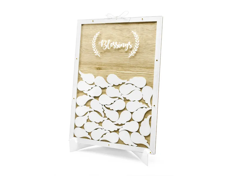 Drewniana księga gości z białym napisem Blessings, zestaw zawiera prostokątną księgę w oraz 30 białych skrzydełek do wypisania, wymiary ok. 27,5 x 39,5 cm.