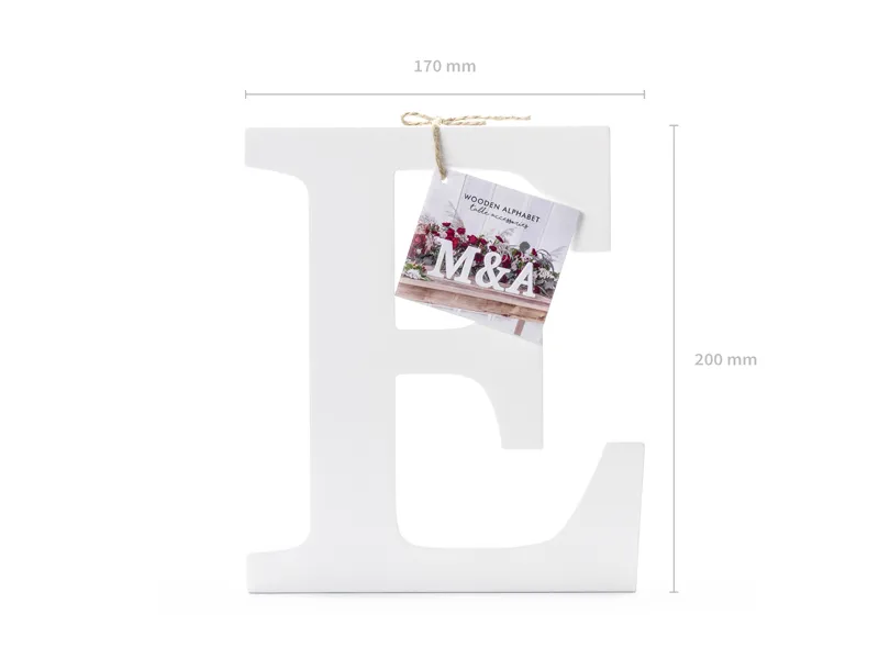 Litera E wykonana z drewna w kolorze białym, szerokość ok. 17 cm, wysokość ok. 20 cm