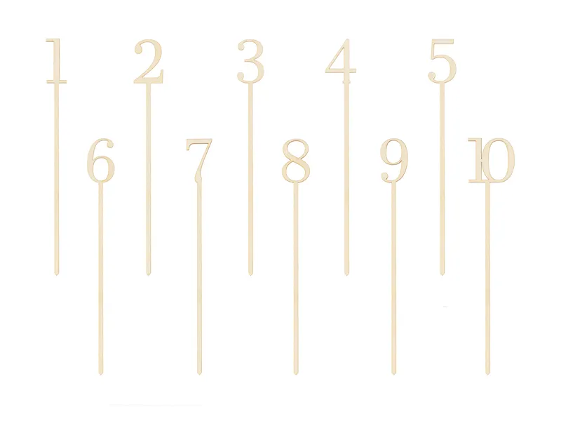 Drewniane numery na stół, zestaw zawiera numery od 1 do 10, wysokość ok. 25 cm. (1 op. / 10 szt.)