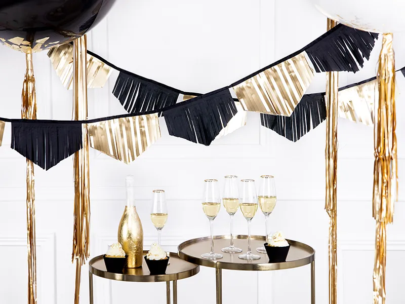 - Sylwester i karnawał: Girlanda frędzle z czarnej bibuły i złotej folii doskonale nadaje się do dekoracji przestrzeni na Sylwestra i karnawał, nadając imprezie elegancki, a zarazem radosny klimat.