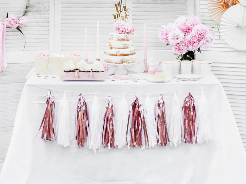 Girlanda frędzle, do samodzielnego złożenia, zestaw zawiera 12 frędzli w kolorze białym i ok. 2 m białego sznurka, wymiary po złożeniu: wysokość ok. 30 cm, długość ok. 1,5 m.