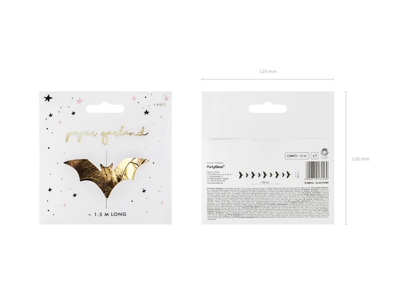 Przeszywana girlanda Nietoperze w kolorze metalicznym złotym, wykonana z papieru, długość ok. 1.5 m, szerokość ok. 11 cm.