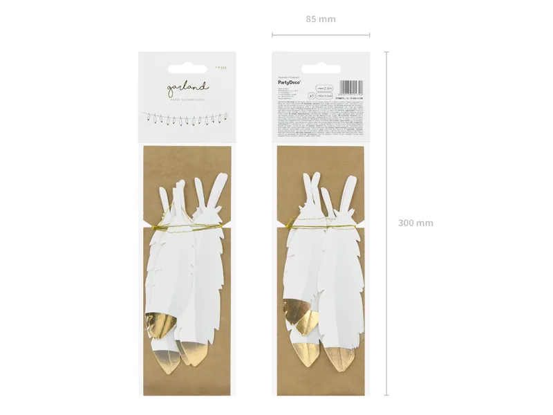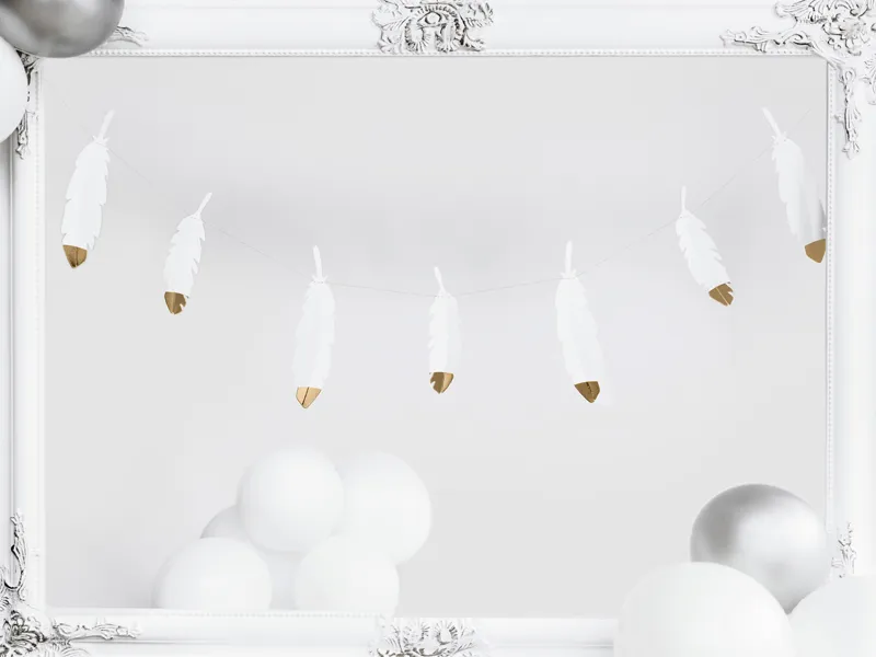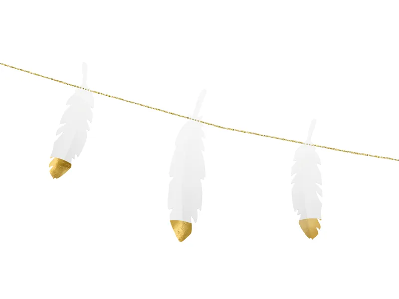 Girlanda przeszywana Piórka w kolorze białym ze złotymi metalizowanymi końcówkami, wymiary: wysokość ok. 13,5 cm, długość ok. 1,6 m.