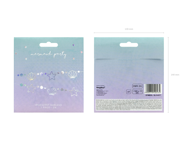 Girlanda Syrenka Opalizująca to dekoracja, która doskonale komponuje się z innymi produktami z kolekcji Syrenka. Idealnie pasuje do balonów w odcieniach błękitu i fioletu, które przywodzą na myśl podwodny świat pełen magii. Możesz ją zestawić z serwetkami muszelkami, talerzykami Narwal, czy dekoracjami w kształcie meduz, tworząc harmonijną całość. Zawieszona w centralnym punkcie sali, połączona z innymi elementami morskiej kolekcji, tworzy przepiękny, opalizujący efekt, który ożywia każde przyjęcie. Uzupełniona o tiulowe bieżniki czy ozdobne pudełka, pozwala na stworzenie prawdziwego podwodnego świata, w którym każdy gość poczuje się jak w bajce.